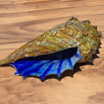 Reactive Amber and Ocean Colored Conch Shell with Blue Optic Twist Inside. 11.5″ Long x 6.5″ Tall